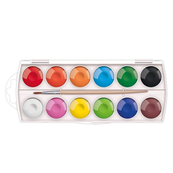 Kvalitní pigmentové, 12 kusové, vodové barvy se štětcem v pevném plastovém pouzdře pro předškolní a školní děti.